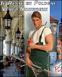 Plombier polonais devant des monuments historiques de Cracovie et Varsovie. Affiche de l'Office polonais du tourisme à Paris.